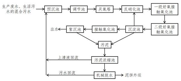 出水由水泵打入厭氧池,利用厭氧反應中的水解酸化階段和甲烷發(fā)酵階段。通過厭氧微生物的新陳代謝功能將廢水中的有機物得以大幅度降解;使后續(xù)處理單元的停留時間小于傳統(tǒng)的工藝,與此同時,懸浮固體物質被水解為可溶性物質,使污泥得到處理。厭氧池懸掛填料,以提供生物棲息的場所。厭氧池設布水裝置,防止污泥的沉積,保持生物活性,厭氧池出水進入曝氣池,在好氧菌的作用下,有機物被降解,出水進入沉淀池進行泥水分離,污泥回流至曝氣池,上清液進入接觸氧化池。